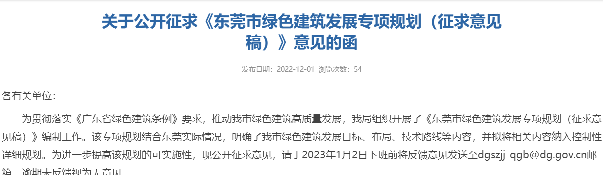 關(guān)于公開征求《東莞市綠色建筑發(fā)展專項(xiàng)規(guī)劃(征求意見稿)》意見的函發(fā)布日期:2022-12-01 瀏...